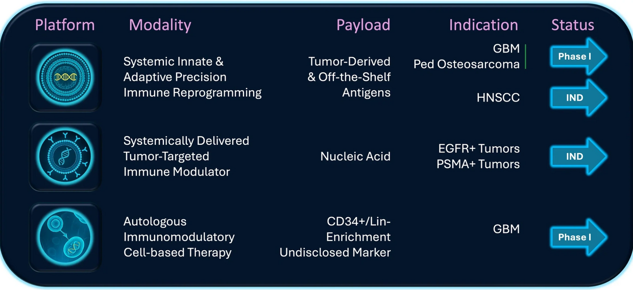 iOncologi’s multi-platform pipeline spans three first-in-class immunotherapeutic approaches designed to address the most intractable solid tumors, including glioblastoma (GBM), pediatric osteosarcoma, EGFR-positive and PSMA-positive malignancies. Together, these programs leverage proprietary delivery technologies, precision immune activation, and AI-guided antigen discovery to re-engineer the tumor–immune interface.